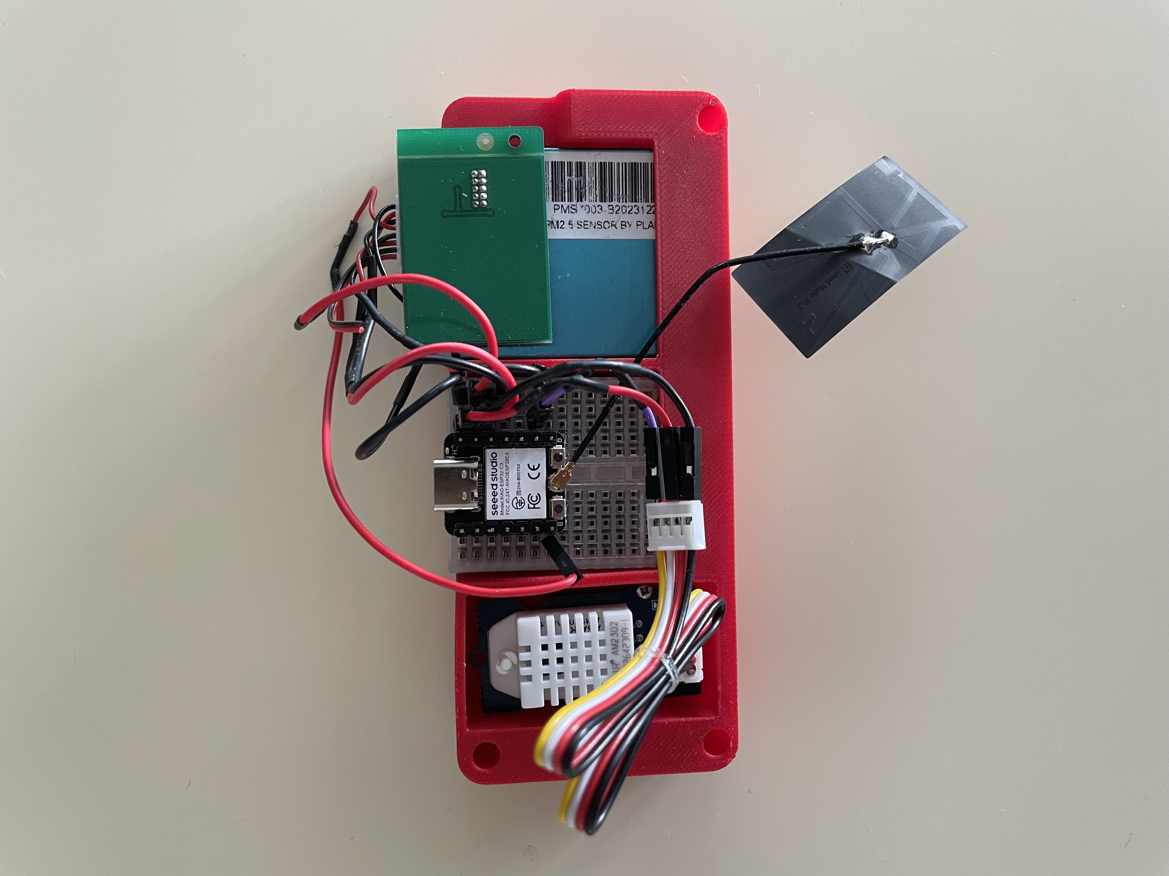 Pour regrouper temporairement le microcontrôleur Seeed Studio XIAO, un capteur de qualité de l’air et un capteur de température et d’humidité, un boîtier temporaire imprimé en PLA a été conçu en attendant la fabrication d’un circuit imprimé finalisé. Ce boîtier facilite l’intégration provisoire de ces composants sur le site tout en offrant une protection mécanique et une facilité d’entretien.