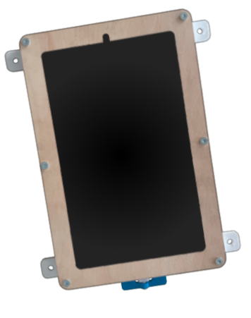 Voici le support final. Il vient se fixer au mur, un cadre en bois permet de maintenir la tablette et un antivol pour le chargeur est présent.